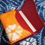 着物の染色技法「巻き上げ絞り」を革に応用した手法で染めています。染めの濃淡や模様の表情がワンポイントになります。使用するすべての革は、工房で職人が手染めをしています。